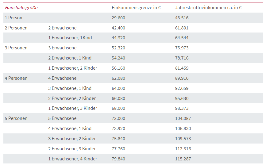 Berechtigt sind Personen, deren Einkommen bestimmte Grenzen nicht überschreiten - bei einer vierköpigen Familie zum Beispiel entspricht diese Grenze einem Bruttojahreseinkommen in Höhe von 95.600 €. Weiterhin sind wir bei der Vermietung der Wohnungen an die maßgebliche Wohnungsgröße für den jeweiligen Haushalt gebunden. Dieser entspricht z.B bei einem Einpersonenhaushalt 50 m² oder 1 Zimmer.